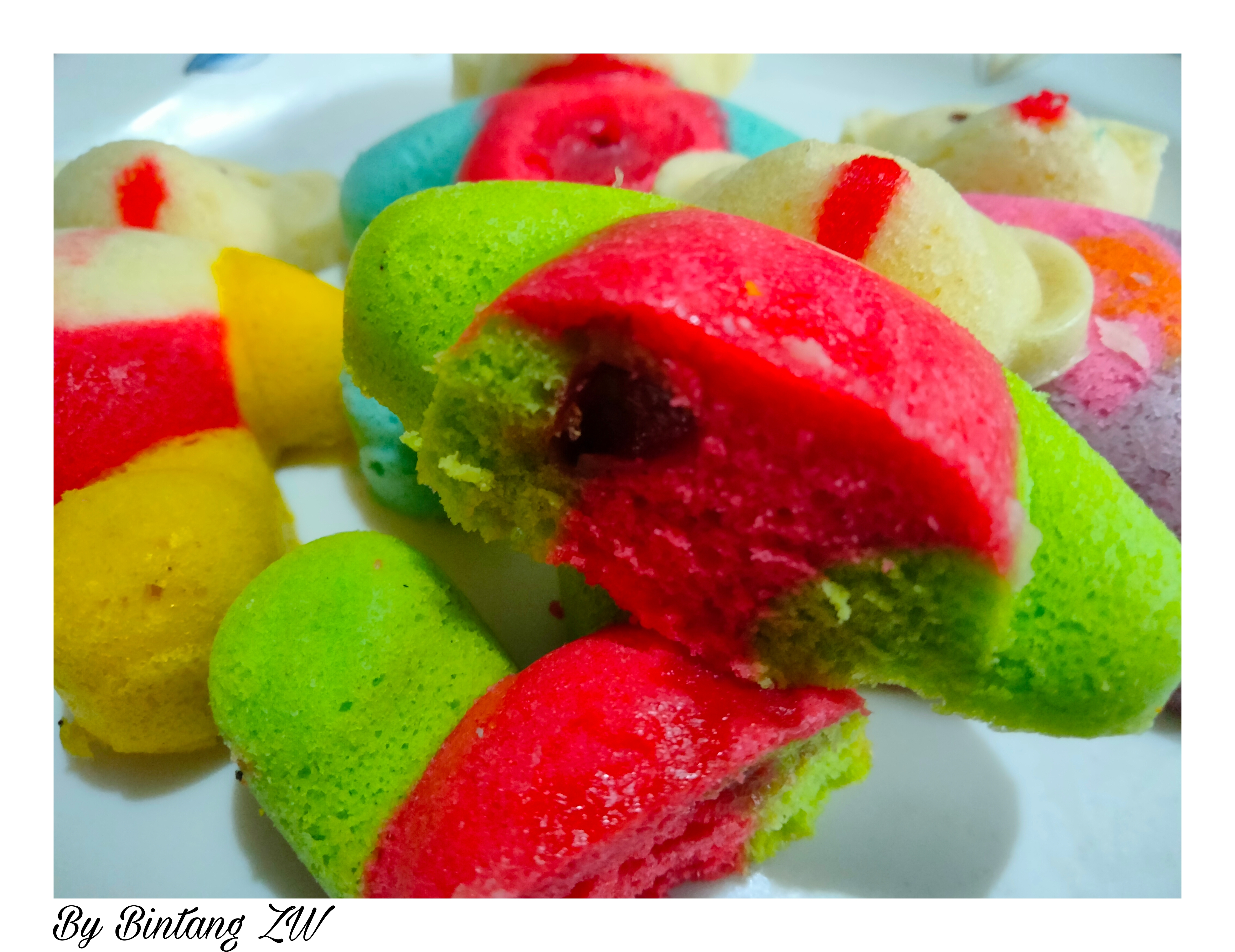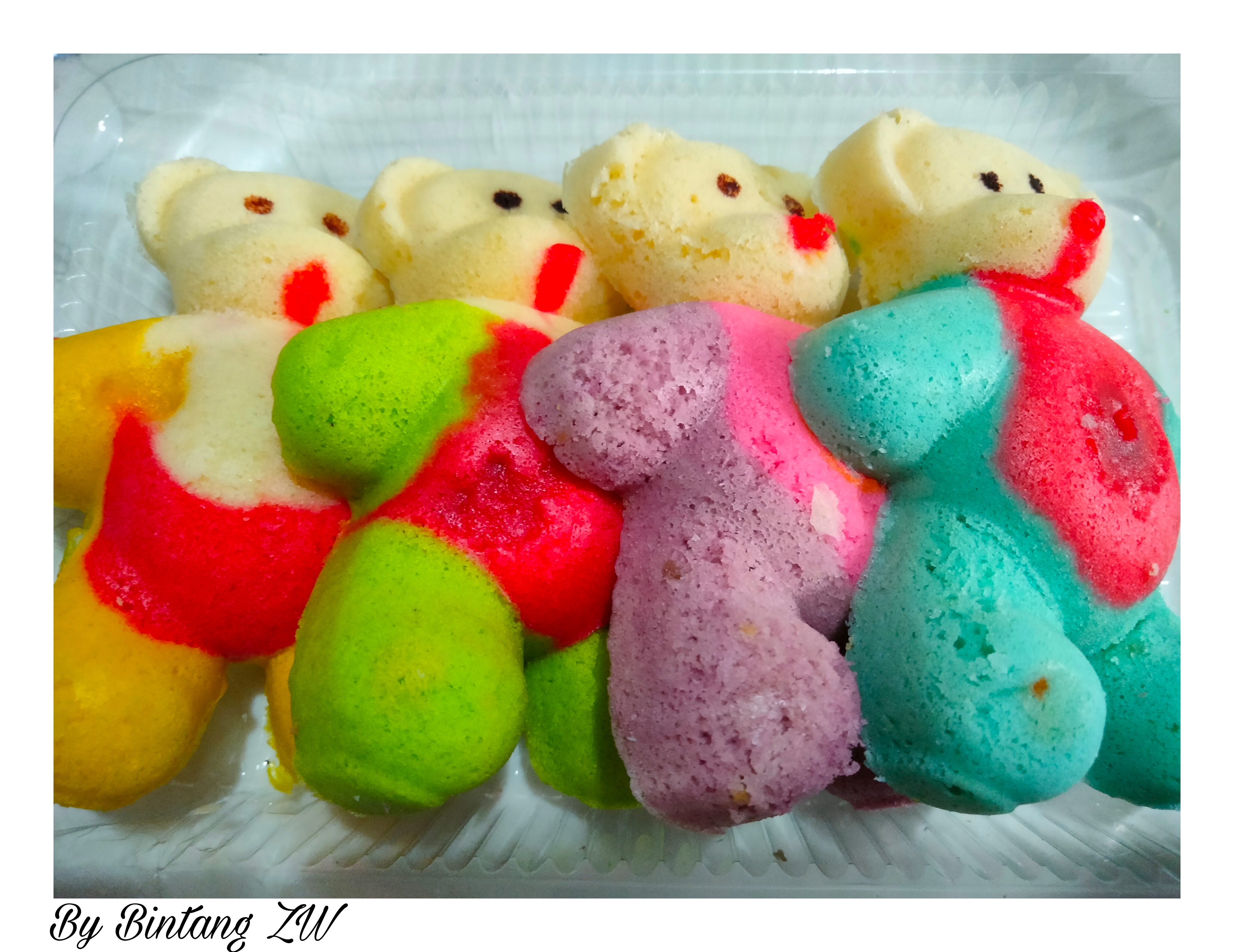 Bolu Kukus Beruang. This cake usually always are bought by many children, because the cute shape and the beautifull color of this cake. Usually there is a Strawberry jam inside of this cake. It is made of Sponge batter in general. The cost of this cake is very cheap start from Rp. 2000/Cup.